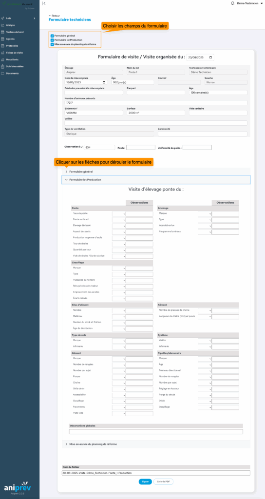Les comptes rendus de visite permettent au technicien de créer un compte-rendu de visite avec un formulaire pré-existant. Il signe ensuite sa fiche et génère un PDF qui peut être consulté parmi les documents du lot. Le technicien choisit les champs qu’il va remplir en cochant un ou plusieurs des choix suivants :